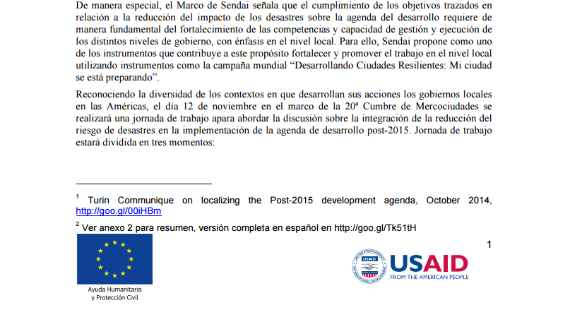 Estimados, Tenemos el Agrado de Acercarles la Siguiente Información: referente a la jornada de trabajo ‘Reflexiones sobre retos y oportunidades para la implementación de la agenda de desarrollo post–2015 en el nivel local, con énfasis en la gobernanza de la gestión del riesgo de desastres’ junto con el relanzamiento regional de la campaña Desarrollando Ciudades Resilientes: Mi ciudad se está desarrollando 2016-2020 que se realizarán el día 12 de noviembre en Sao Paulo, Brasil en el marco de la Cumbre de Mercociudades.